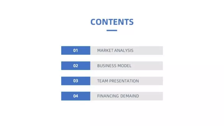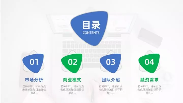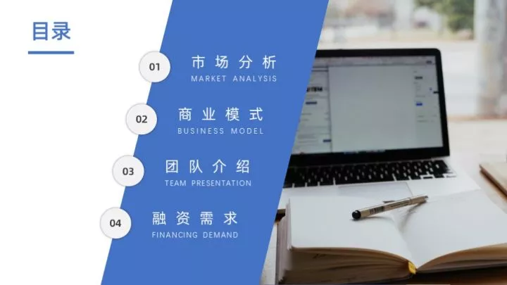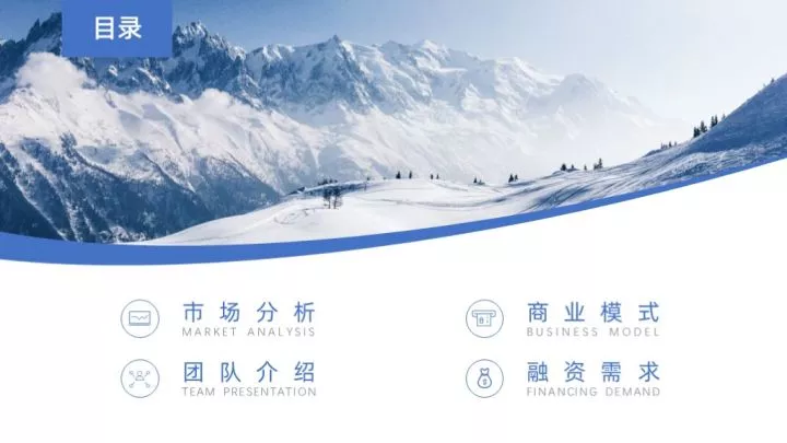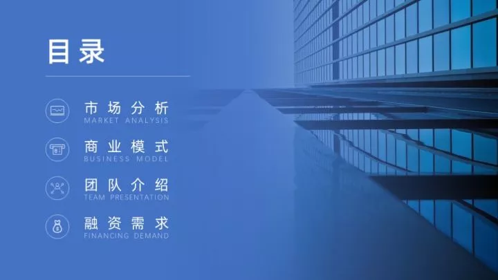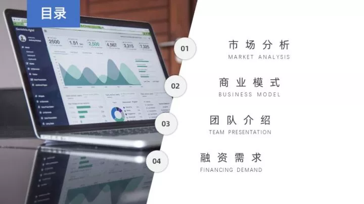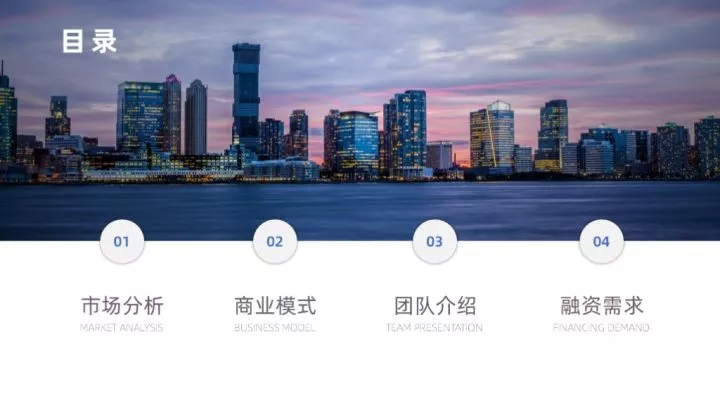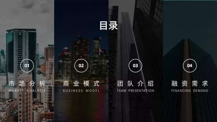 全图型目录是将整张PPT以图片作为最主要的元素,将目录信息放置于图片上,制作起来非常的简单。