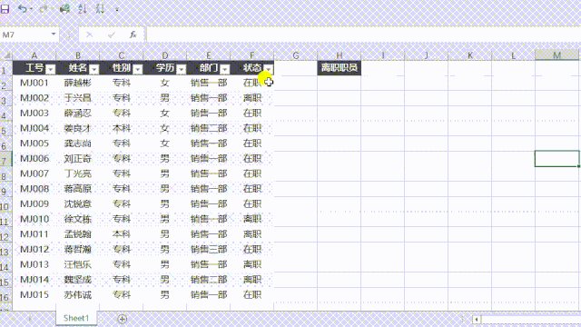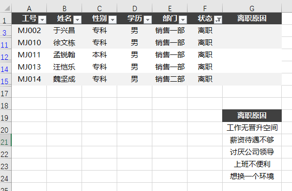 这是一个非常基础的操作,当然我们可以利用公式来完成,不过对于初学者来说不算太友好。例如下方数据,我们想提取出「离职」的同事。