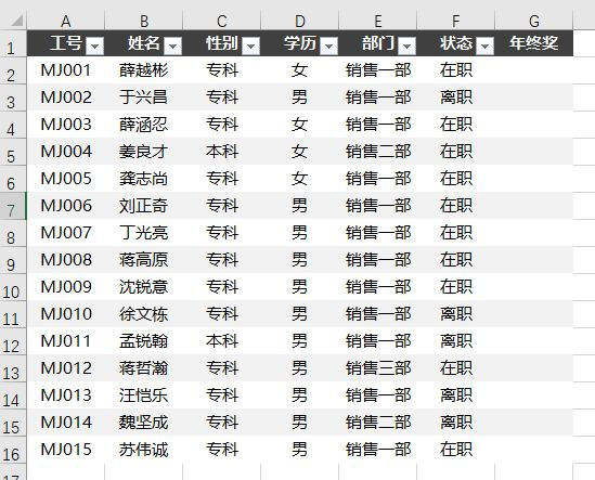 除了将筛选结果复制出来,为筛选结果填充数据也是一个非常常见的需求。如下,为所有「在职」的员工颁发「年终奖」5000元,「离职」员工不填写年终奖。