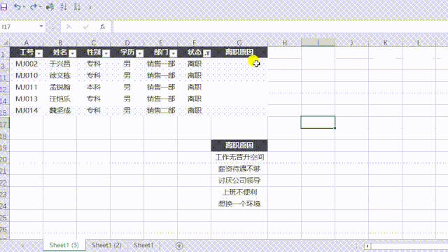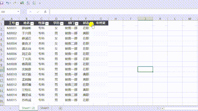 其实利用筛选就可以快速实现这个需求,我们在「状态」中筛选出「离职」,然后选中姓名,按「Ctrl+G」打开「条件定位」,选择「可见单元格」,然后「复制」,最后展开所有数据,然后粘贴刚刚复制的数据即可。