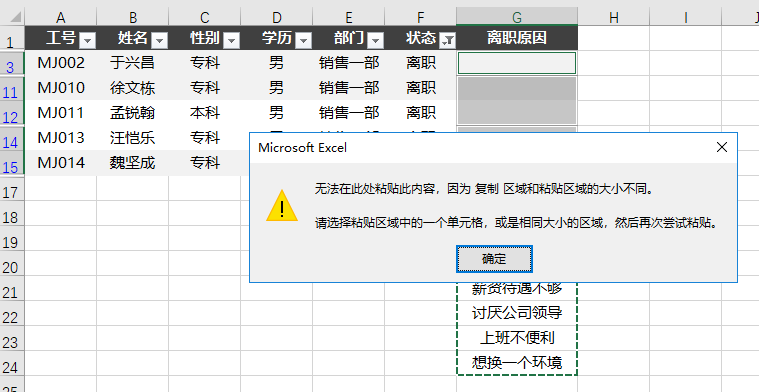 如果这个时候我们直接选中数据,复制之后,定位筛选中的可见单元格,进行数值粘贴,会提示我们「无法在此处粘贴内容…」。