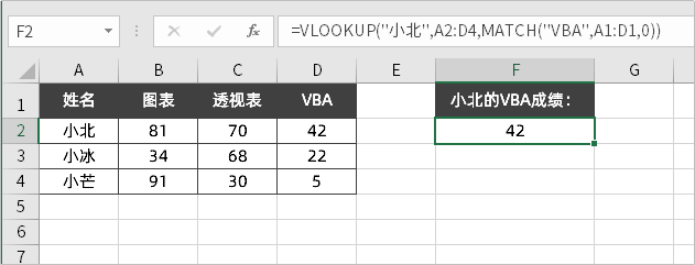 =VLOOKUP("小北", A2:D4, MATCH("VBA", A1:D1, 0))Code language: Excel (excel)