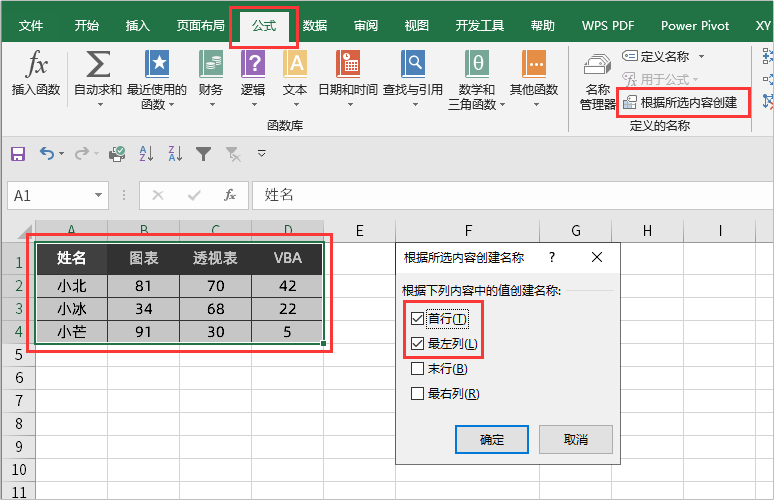 将「二维表」快速命名的技巧非常简单,「选中」表格之后,点击「公式」选项卡下的「根据所选内容创建」。