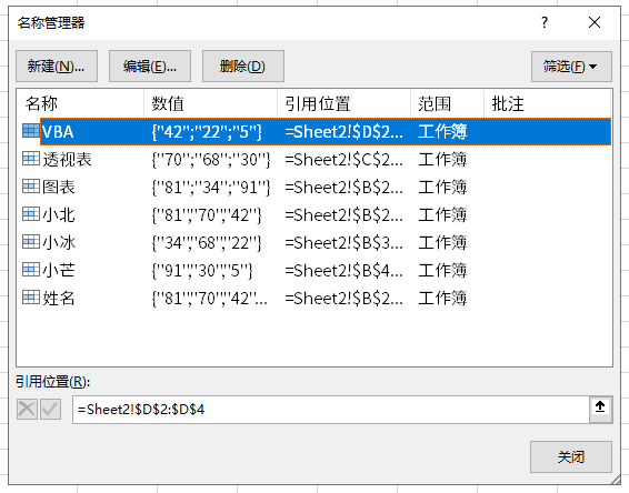 这样在「公式」选项卡下的「名称管理器」中就能看到命名的区域了,可以看到「人名」和「科目」全部被命名: