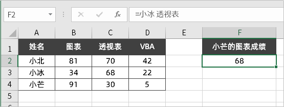 =INDEX(B2:D4, MATCH("小芒", A2:A4, 0), MATCH("图表", B1:D1, 0))Code language: Excel (excel)