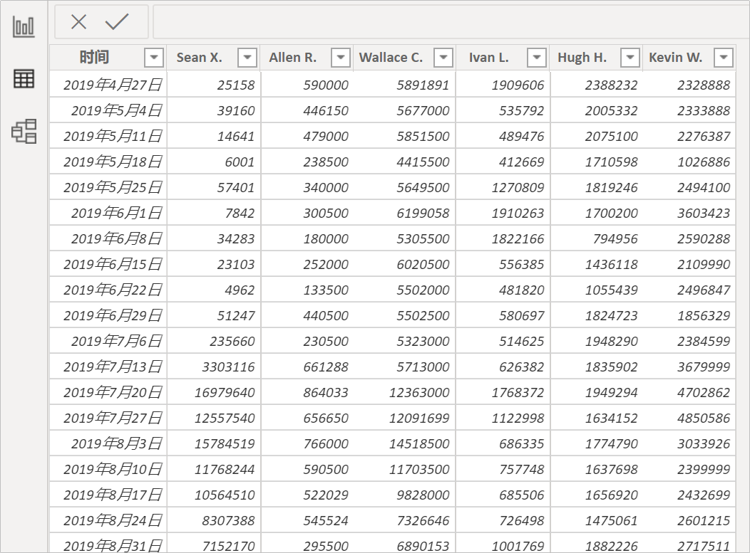 操作的技巧也非常简单,只需要两个数据坐标轴的数据,例如我们将下面这张「男明星人气表」导入到PowerBI中。