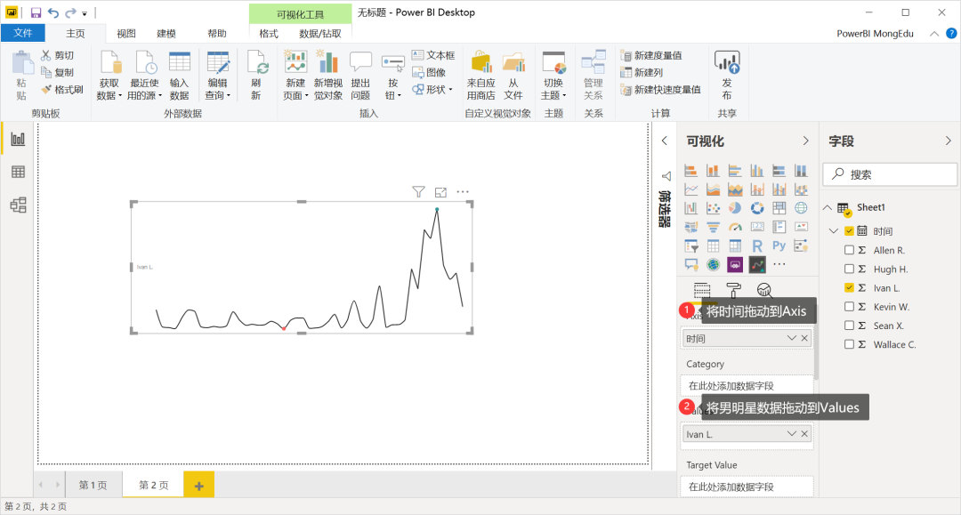 接着将「时间」拖动到Aixs,随意一个「男明星」拖动到Values里,最基础的效果就绘制完成了。