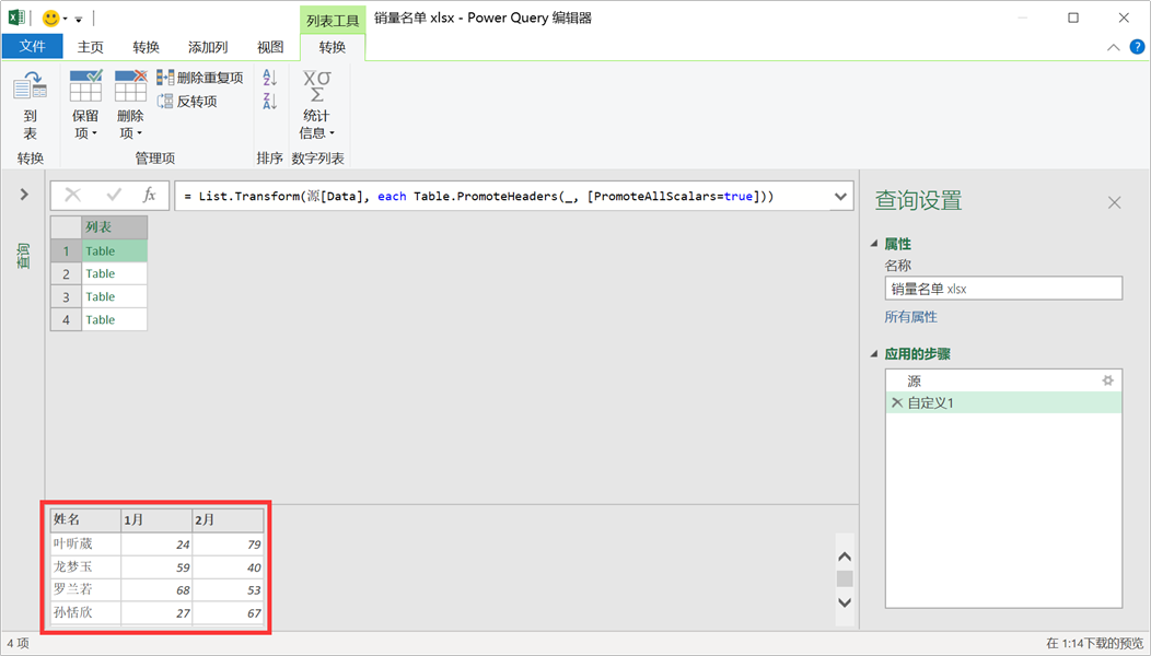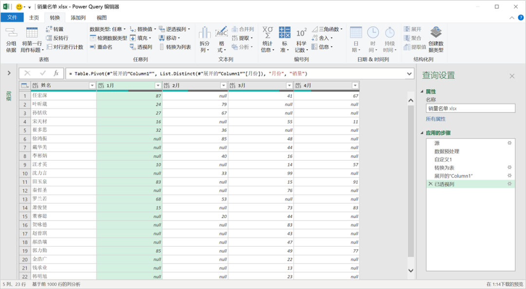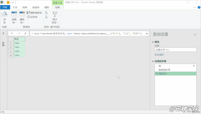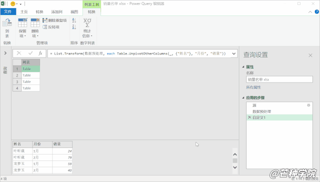 = List.Transform(数据预处理, each Table.UnpivotOtherColumns(_, {"姓名"}, "月份", "销量"))Code language: Excel (excel)