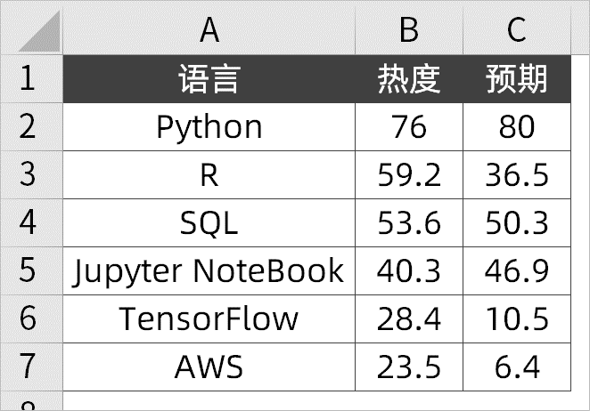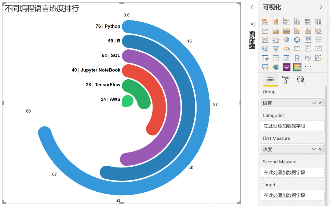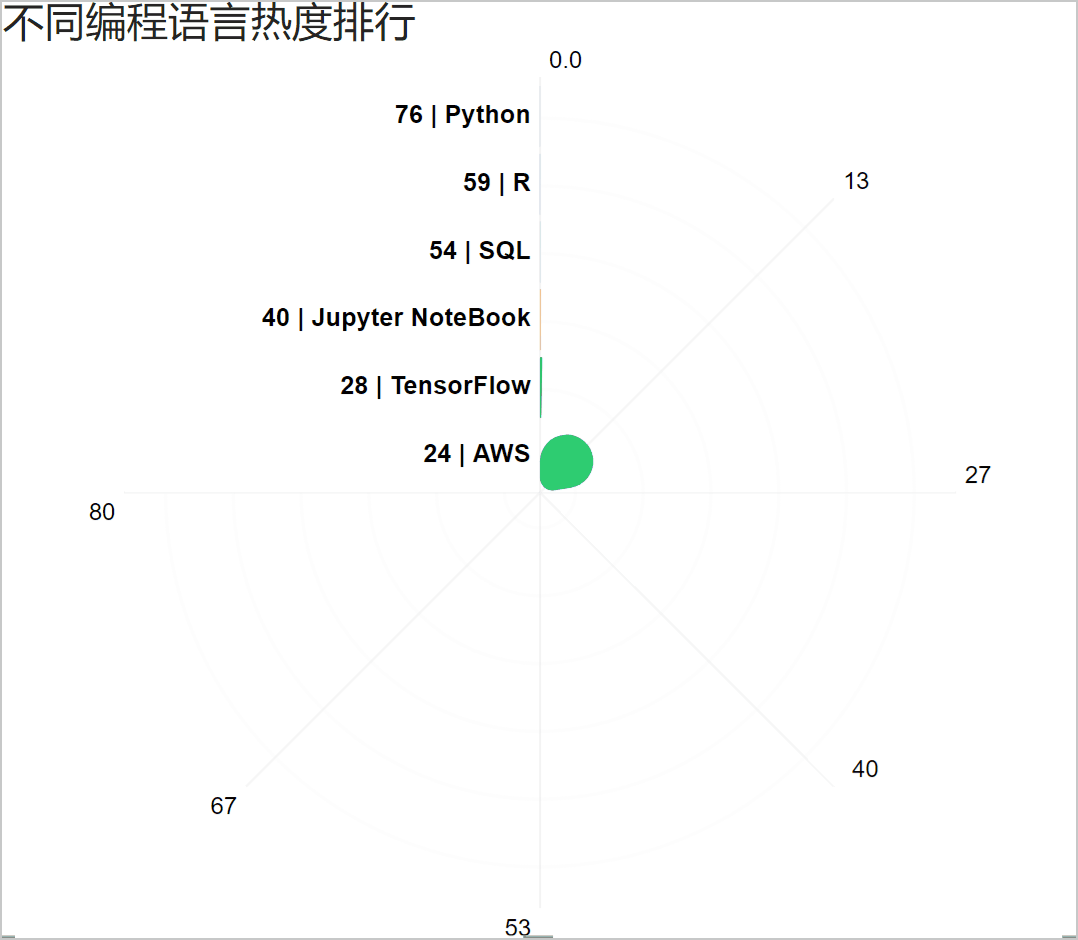 绘制「径向条形图」的数据非常简单,这里用到了「语言」和「热度」两个字段,数据如下。