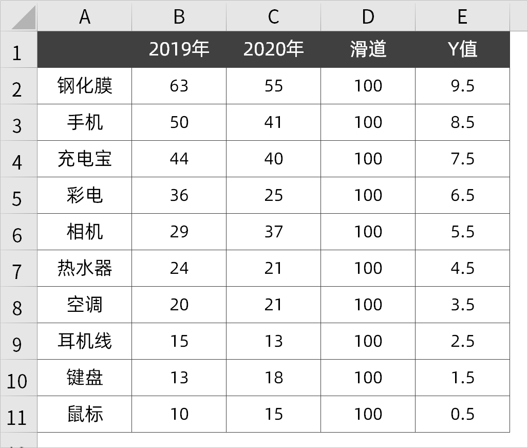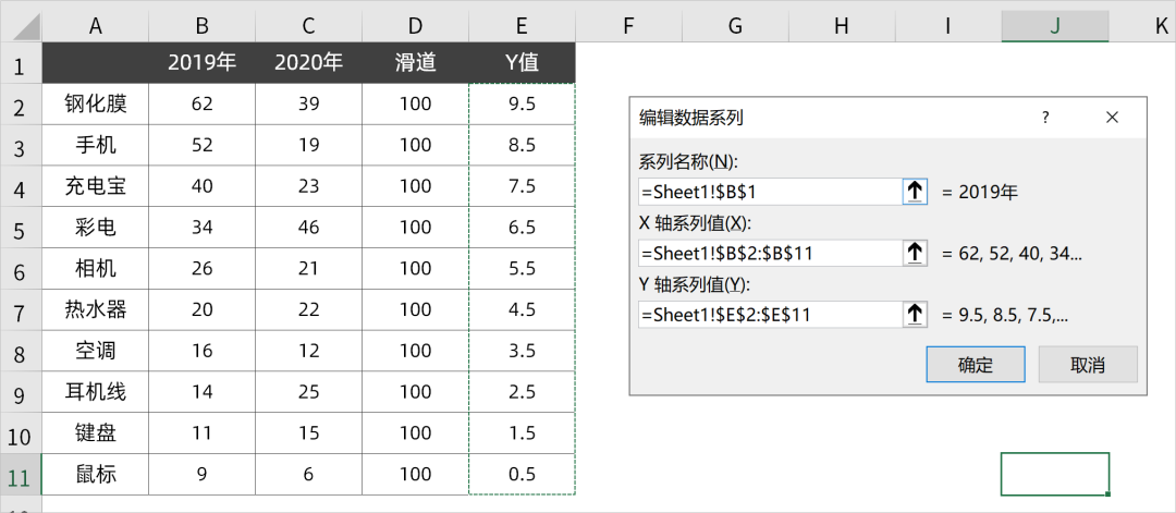 一个是固定的数字滑道,另外一个是滑珠的Y轴数值,辅助列如下: