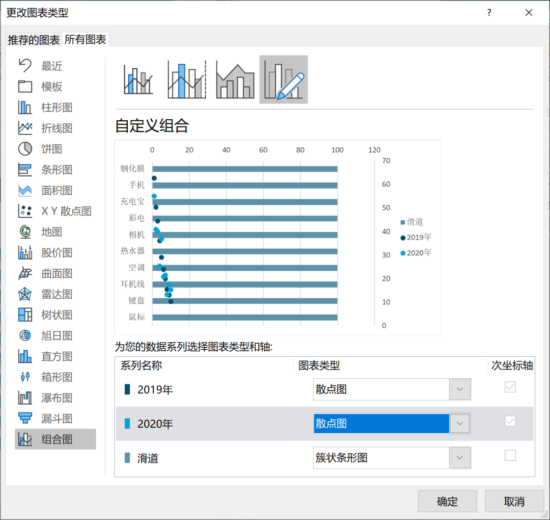 接下来将「2019年」和「2020年」的数据修改为散点图,效果如下。