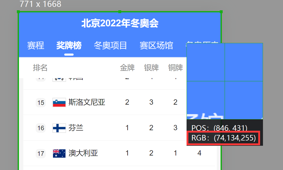 这里的RGB就是鼠标指向的颜色数值了,冬奥会奖牌可视化中的颜色并不多。