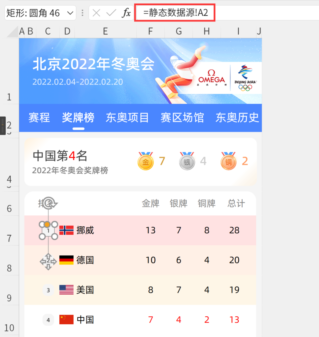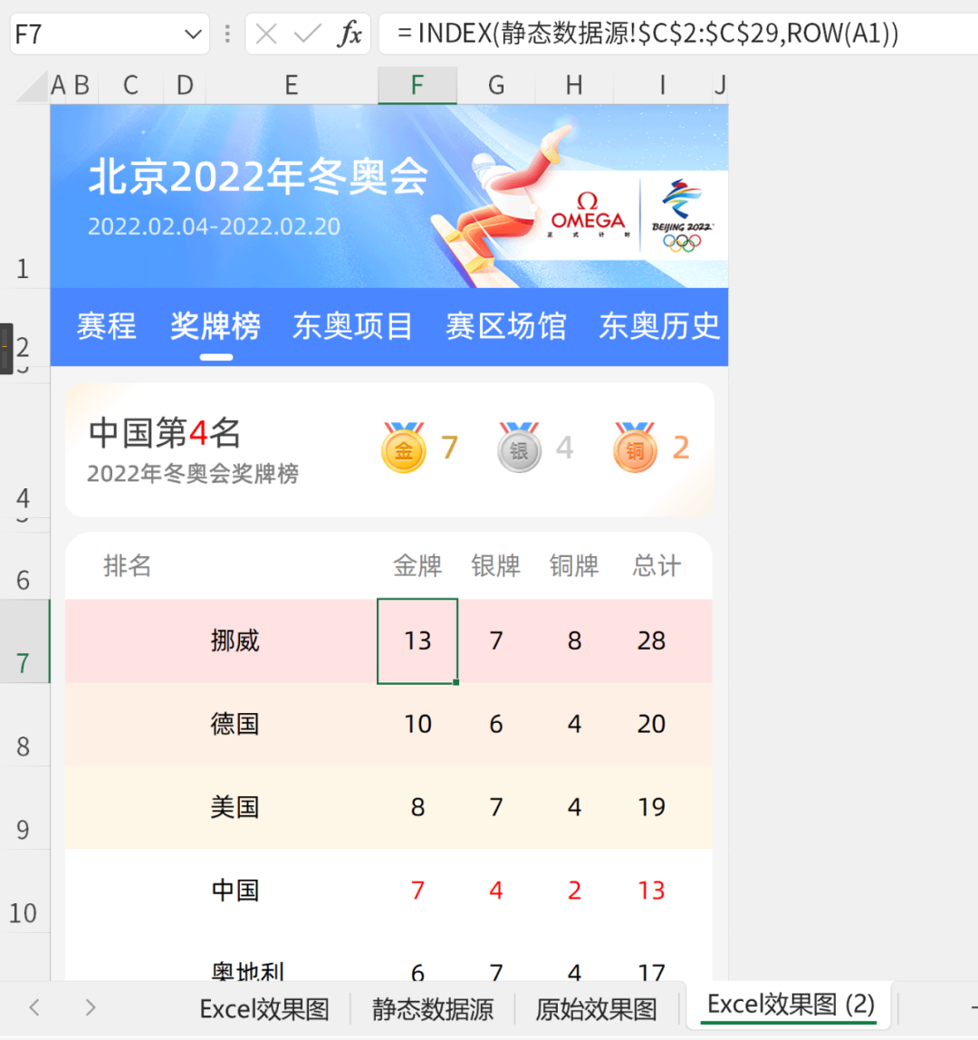 铜牌:=INDEX(静态数据源!$E$2:$E$29,ROW(A1))