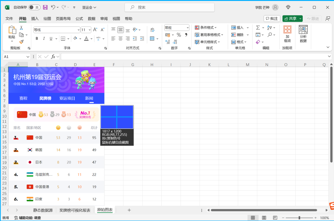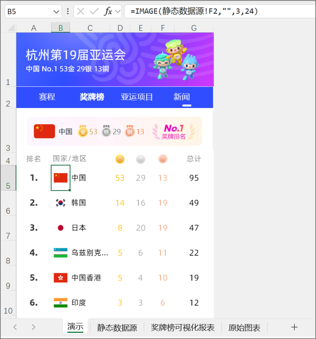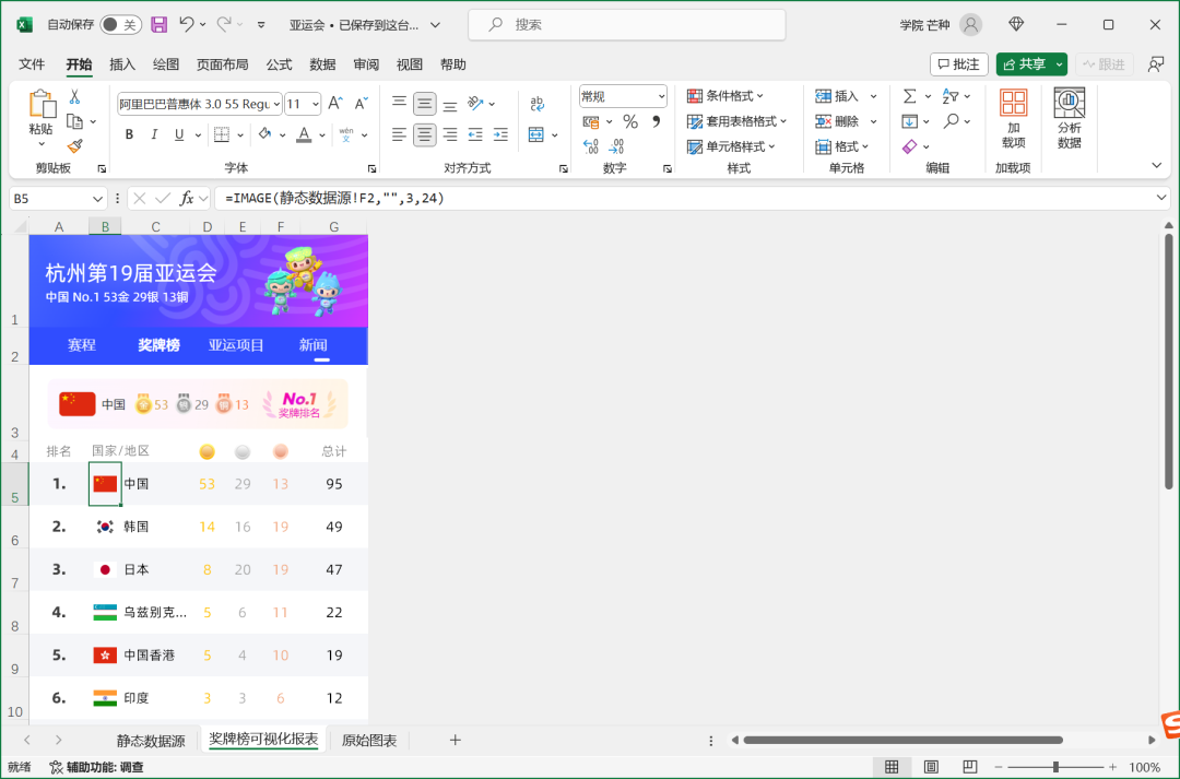 然后用超链接关联上即可,这样一份亚运会奖牌可视化报表就只做完毕啦!
