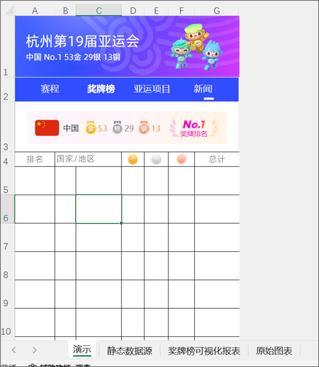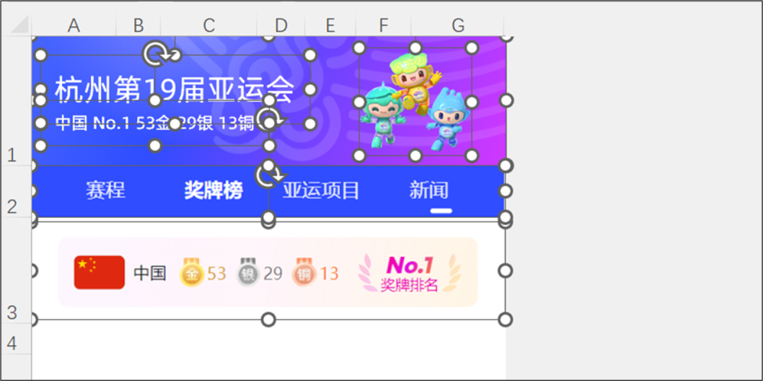 简单吧,最后就是【赛程】【奖牌榜】【亚运项目】【新闻】如果想制作多个报表关联起来,只需要复制 Sheet 独立制作每一个报表。