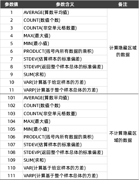 后面参数是计算/引用的区域,眼尖的小伙伴应该就可以发现,当函数类型为 3 位数的时候,不会计算隐藏区域的数据