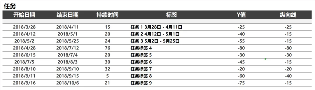 那么总结下,这份图表最基础的数据字段就有:起始/结束日期、Y 轴高度、任务名称,整理成表格,如下。