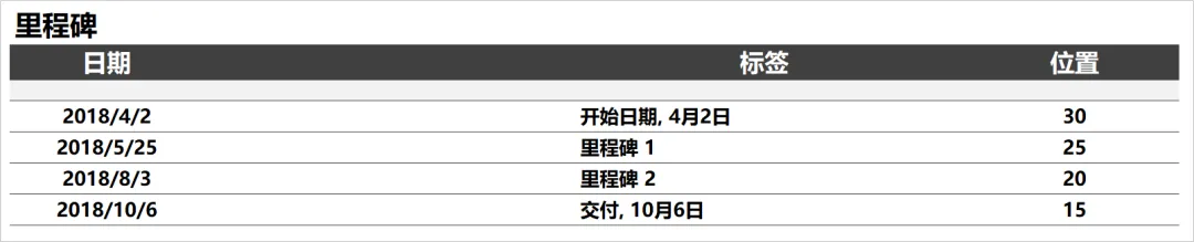 同样里程碑数据也非常简单,也是包含日期、里程碑标签、Y 值位置,如下。