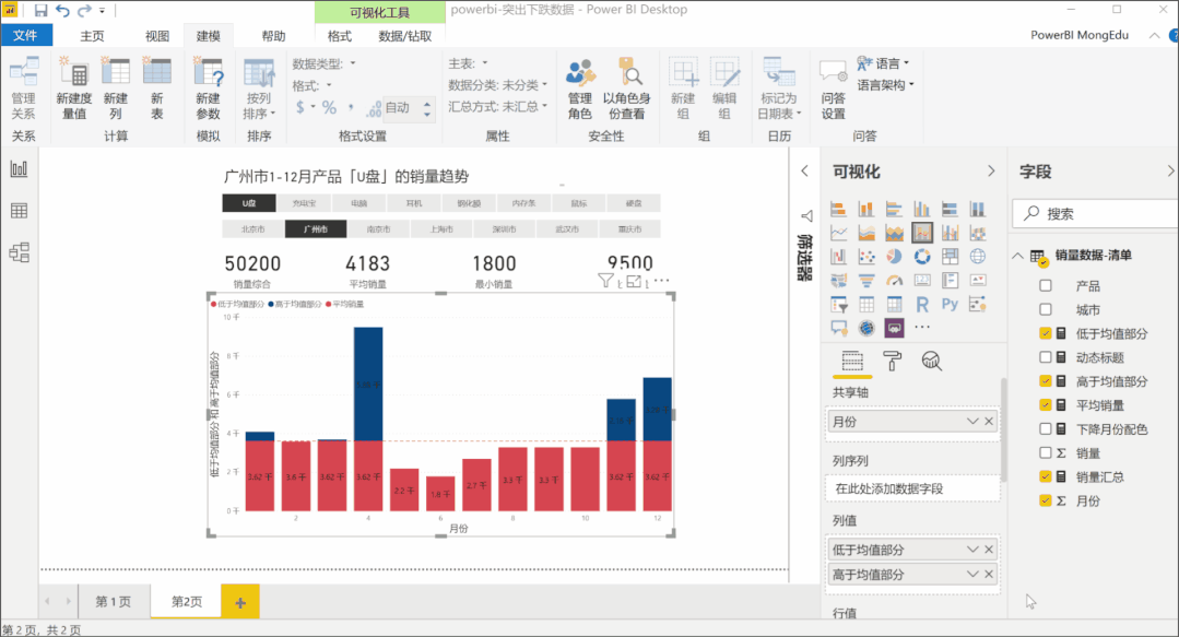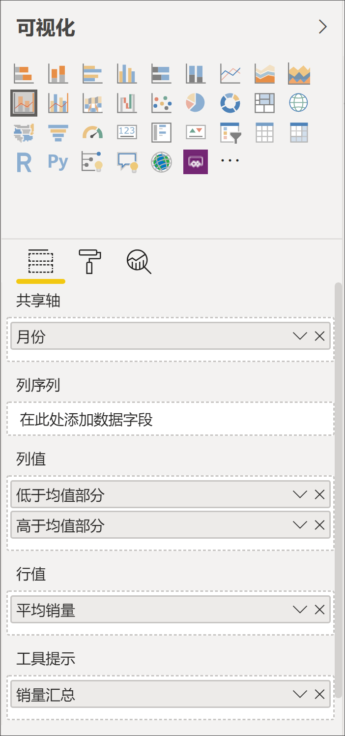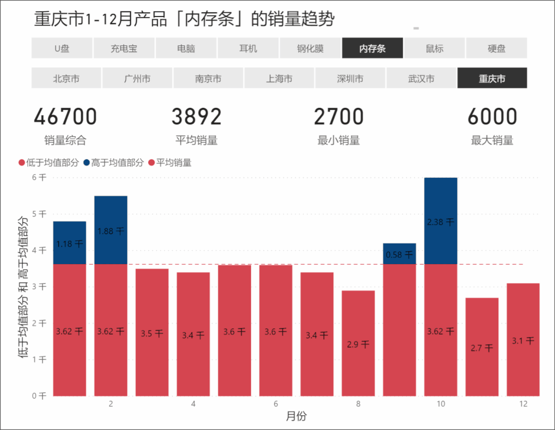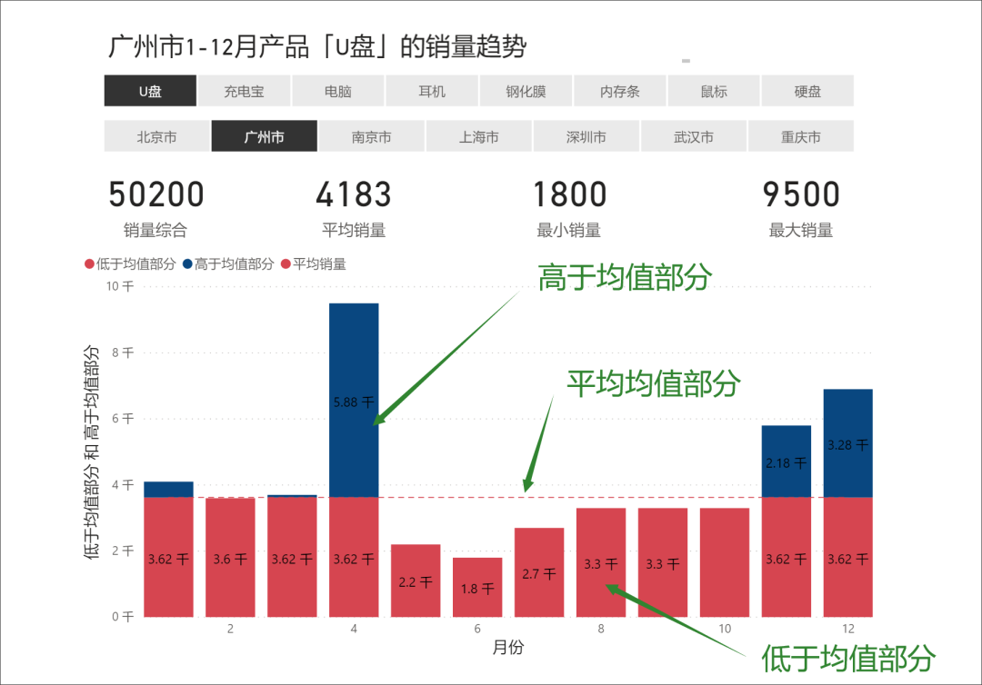 如果还不理解,可以从可视化图表的角度进行思考,”低于/高于平均值“构成”堆积柱状图“,”平均销量“构成折线图。