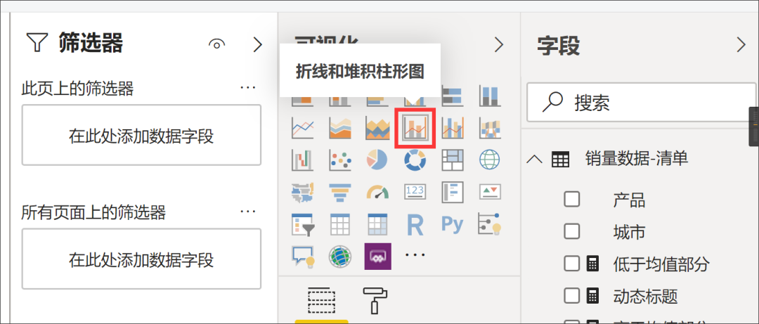 在 PowerBi 中选择「折线图和堆积柱状图」,如下的这个小图标: