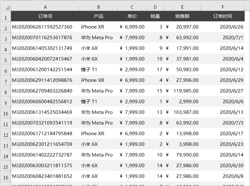 如下是一份电商最近 30 天销售的订单信息表,总共有6个字段: