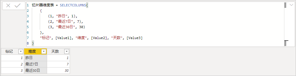 同时为了展示不同维度的数据,这里我们要分别为昨日、最近7日和最近30日写一个累计度量值,如下:
