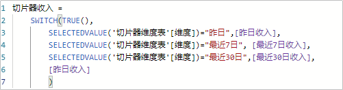 接着将这 3 个度量值使用SWITCH与切片器关联组装到一起: