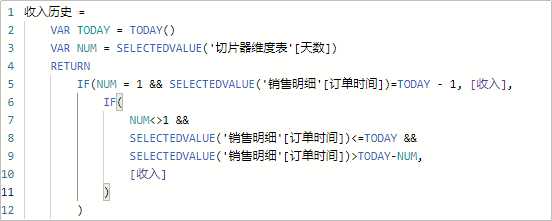 除了累计收入,我们还需要使用柱状图展示不同时间的收入分布情况,这里不需要用到聚合,新建一个度量值,如下: