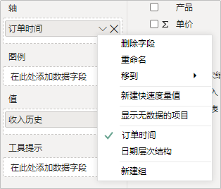 这里用到了几个BI中的内置图表对象,插入「柱状图」,将「订单时间」拖动到「轴」,「收入历史」拖动到「值」。