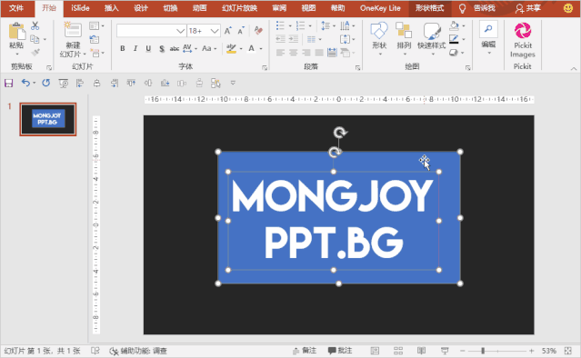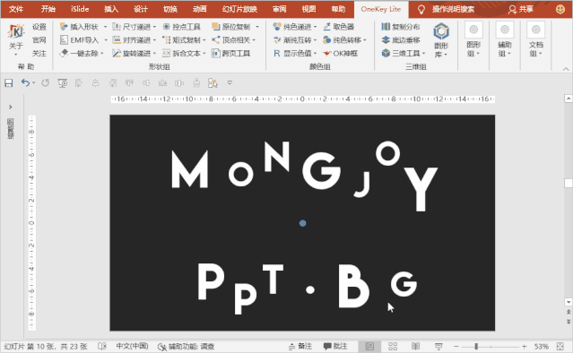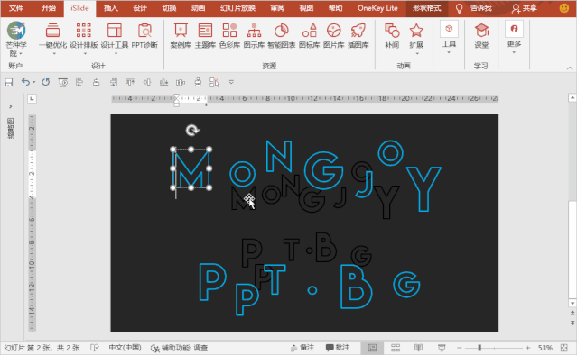 选中「两个形状」,点击「iSlide」下的补间动画,调整下「补间数量」即可,数值越大,越精细,但是也越卡。