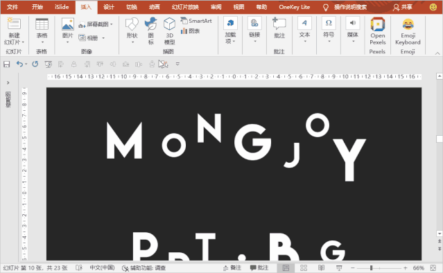 首先我们需要将PPT的背景色设置为黑色,然后插入一段英文,当然使用中文也可以,不过如果中文字体笔划比较复杂, 制作出来的效果就会打折扣。